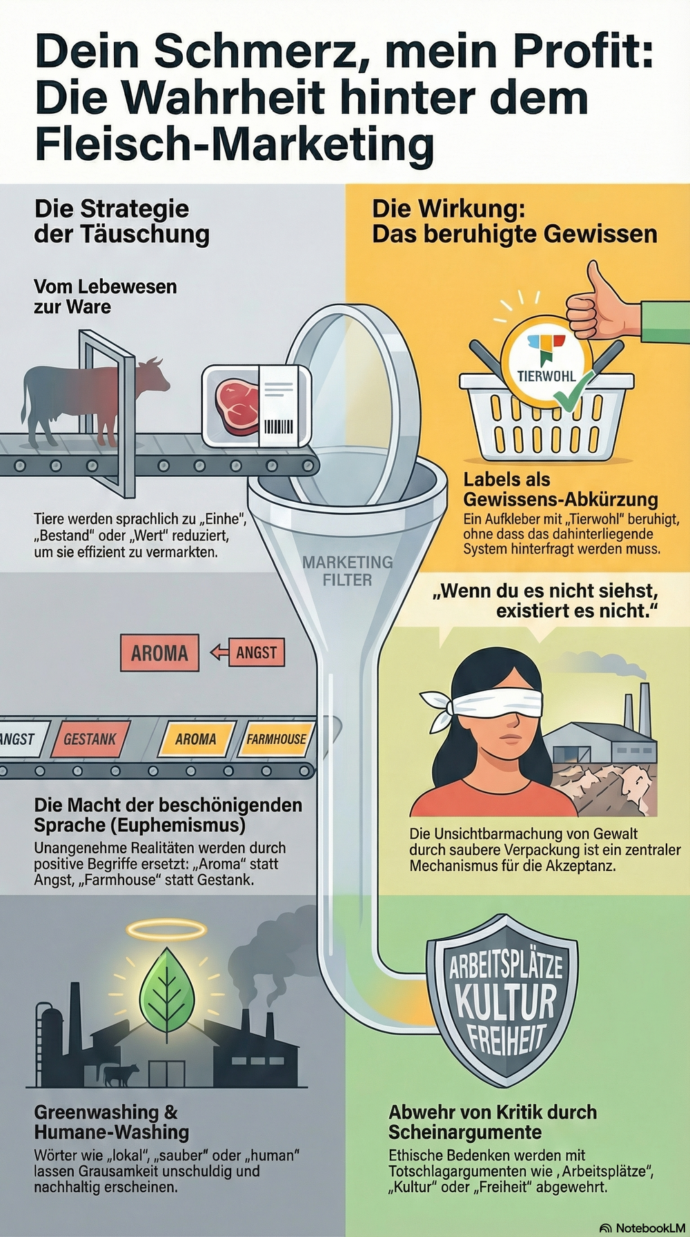 Im Text tauchen typische Beruhigungswörter auf: „local“, „clean“, „farmhouse“, „humane“. Das sind Beispiele für Framing und Euphemismus: Sprache lenkt Aufmerksamkeit weg von unangenehmen Aspekten (Leid, Enge, Stress) hin zu positiven Bildern (Heimat, Tradition, Natürlichkeit). Genau deshalb ist Textarbeit hier auch Arbeit an kritischem Denken.