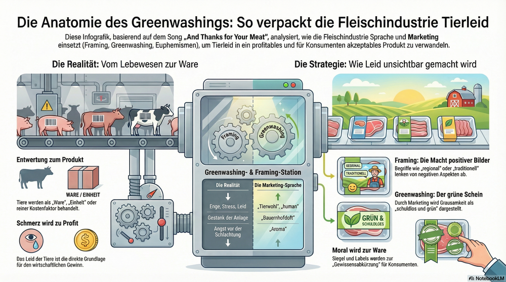 Der Songtext „and thanks for your meat“ (hier: der vorliegende Text) ist eine scharfzüngige, satirische Perspektive auf Massentierhaltung, Fleisch-Industrie, Marketing und die Art, wie Tierleid sprachlich und visuell „verpackt“ wird. Die Stimme im Text spricht wie ein zynischer Akteur der Wertschöpfung: Lebewesen werden zu „Ware“, Leid wird zu „Story“, und Gewissen wird mit Labels, Bildern und beruhigenden Worten besänftigt. Dabei geht es nicht um „Schock“, sondern um Medienkompetenz: Wie wirken Begriffe wie „regional“, „traditionell“, „sauber“, „human“ oder „tierwohl“? Welche Rolle spielen Greenwashing und „Humane-Washing“ (Schein-Humanität durch Branding)? Und warum funktioniert das so gut?