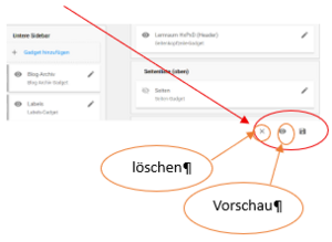 o Nach jeder Layout-Änderung können Sie sich die spätere Darstellung im Blog ansehen, indem Sie rechts oben auf den Button „Vorschau“ klicken. Falls ihnen etwas doch nicht ihren Vorstellungen entspricht können sie natürlich gewählte Elemente wieder löschen.