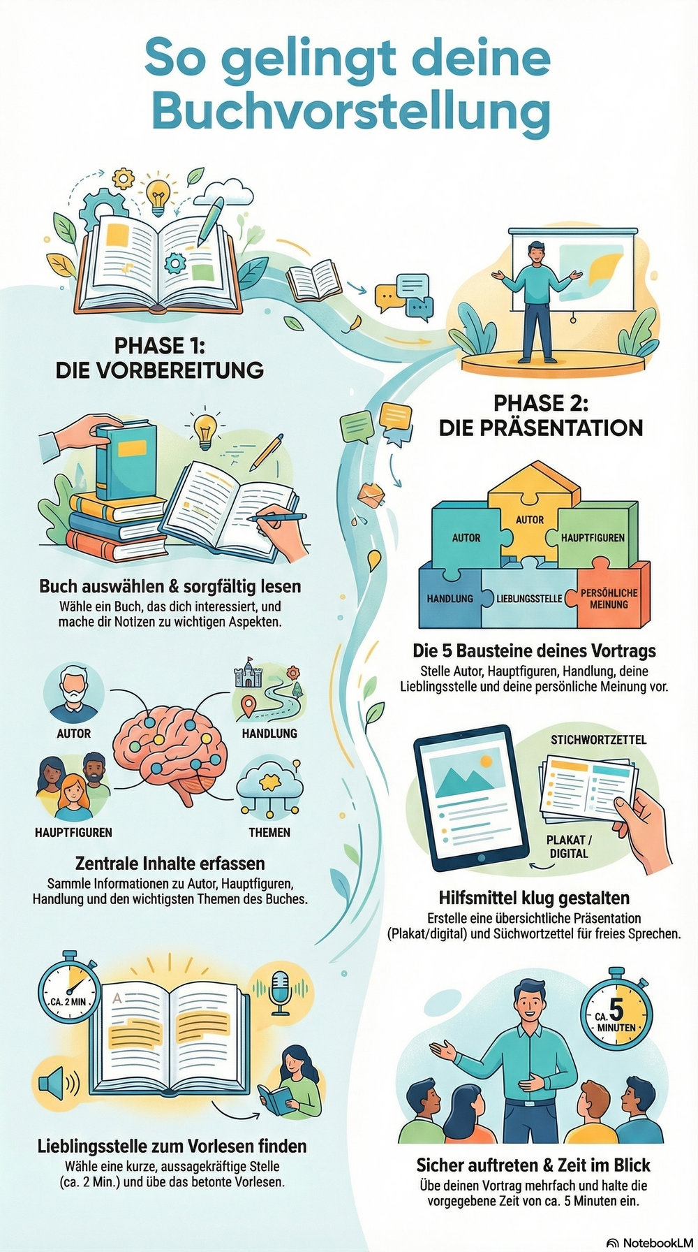 Eine Buchvorstellung ist eine mündliche oder schriftliche Präsentation eines Buches. Sie gibt einen Überblick über den Inhalt, den Autor, die Hauptfiguren und die persönliche Meinung des Vorstellenden zum Buch. Buchvorstellungen sind in Schulen ein beliebtes Mittel, um das Leseverständnis und die Präsentationsfähigkeiten der Schüler zu fördern.