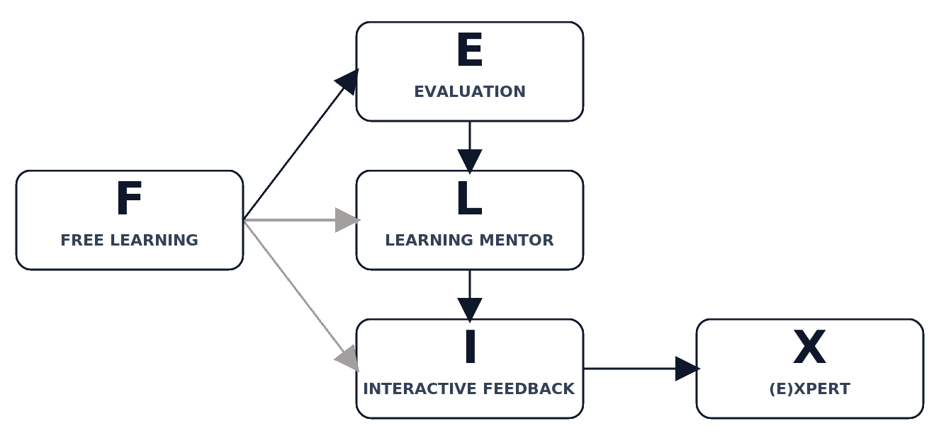HINWEIS: Die Stufen E – Evaluation und L – Learning Mentor sind optional und können, wenn sie aktuell nicht vorhanden sind, übersprungen werden; die Logik des Modells bleibt dadurch erhalten.