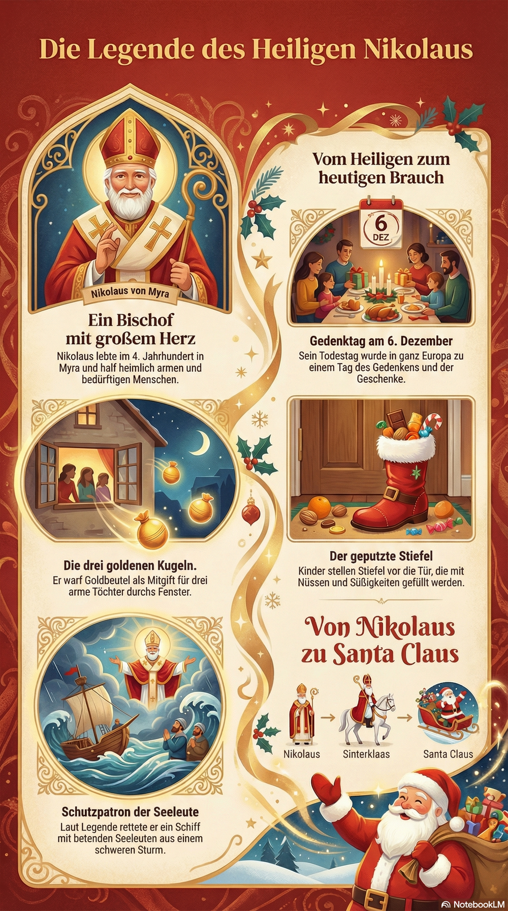 Der Heilige Nikolaus – oft als Nikolaus von Myra bezeichnet – ist einer der populärsten Heiligen der christlichen Tradition. Er lebte der Überlieferung nach im 3.–4. Jahrhundert n. Chr., war Bischof von Myra (heute Demre in der Türkei) und ist für seine Nächstenliebe, Mildtätigkeit und zahlreiche Legenden bekannt. Sein Gedenktag ist der 6. Dezember (in Kirchen, die dem julianischen Kalender folgen, entspricht das dem 19. Dezember). Zu seinen bekanntesten Symbolen zählen drei goldene Kugeln (als Zeichen der Mitgift-Spende für drei verarmte Schwestern), der Krummstab und die Mitra. Nikolaus gilt als Schutzheiliger der Kinder, Seeleute, Händler und vieler weiterer Gruppen. Aus dem niederländischen Sinterklaas entwickelte sich in den USA der Santa Claus, während im deutschsprachigen Raum der Nikolaustag (Stiefelbrauch am Abend des 5. Dezember) sowie Begleitfiguren wie Knecht Ruprecht oder Krampus verbreitet sind.
