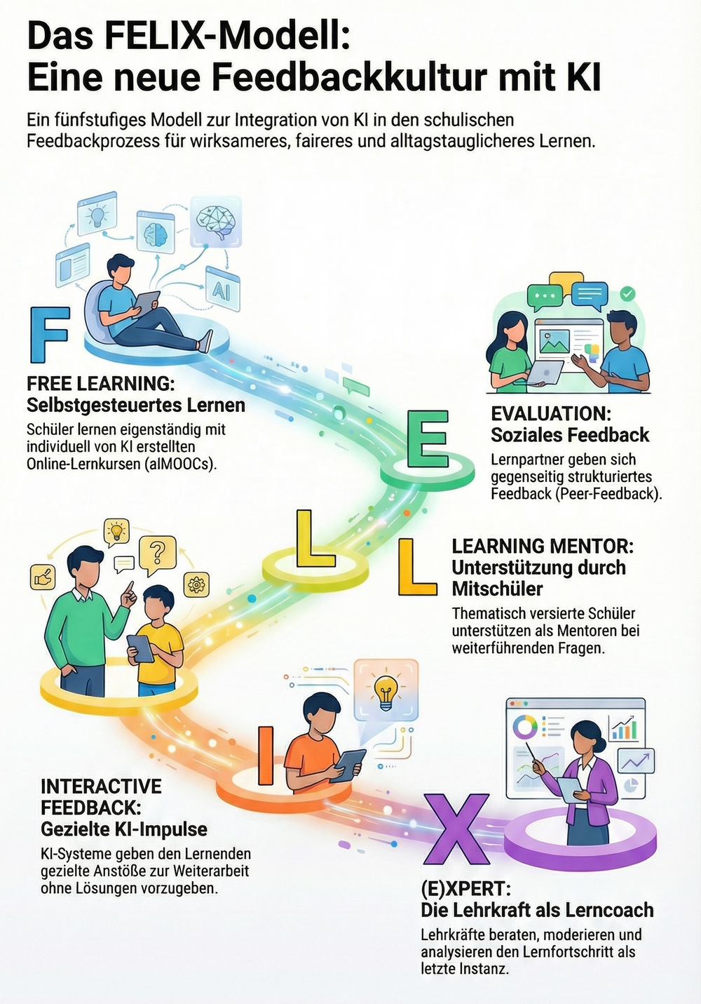 FELIX ist mehr als ein technisches Modell – es ist eine pädagogische Vision: Lernen wird als lebendiger Prozess verstanden, der durch gezieltes Feedback strukturiert, gestützt und vertieft wird. Dabei verbindet FELIX moderne Technologien mit menschlicher Nähe, Eigenverantwortung mit Gemeinschaft und Struktur mit Offenheit.