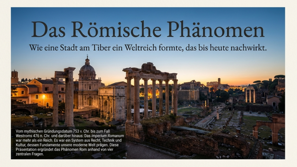 Willkommen zum aiMOOC Imperium Romanum – Zusammenleben im Römischen Reich. In diesem Kurs entdeckst Du, wie sich aus einer kleinen Stadt am Tiber ein weitvernetztes Weltreich entwickelte, das Politik, Recht, Sprache und Kultur Europas und des Mittelmeerraums bis heute prägt. Du lernst die wichtigsten Epochen kennen – von der Königszeit über die Römische Republik bis zur Kaiserzeit –, erkundest den Alltag in Stadt und Provinz, den Ausbau von Straßen, Wasserleitungen und Häfen, die Bedeutung des Limes sowie Handel und kulturellen Austausch mit den Germanen.