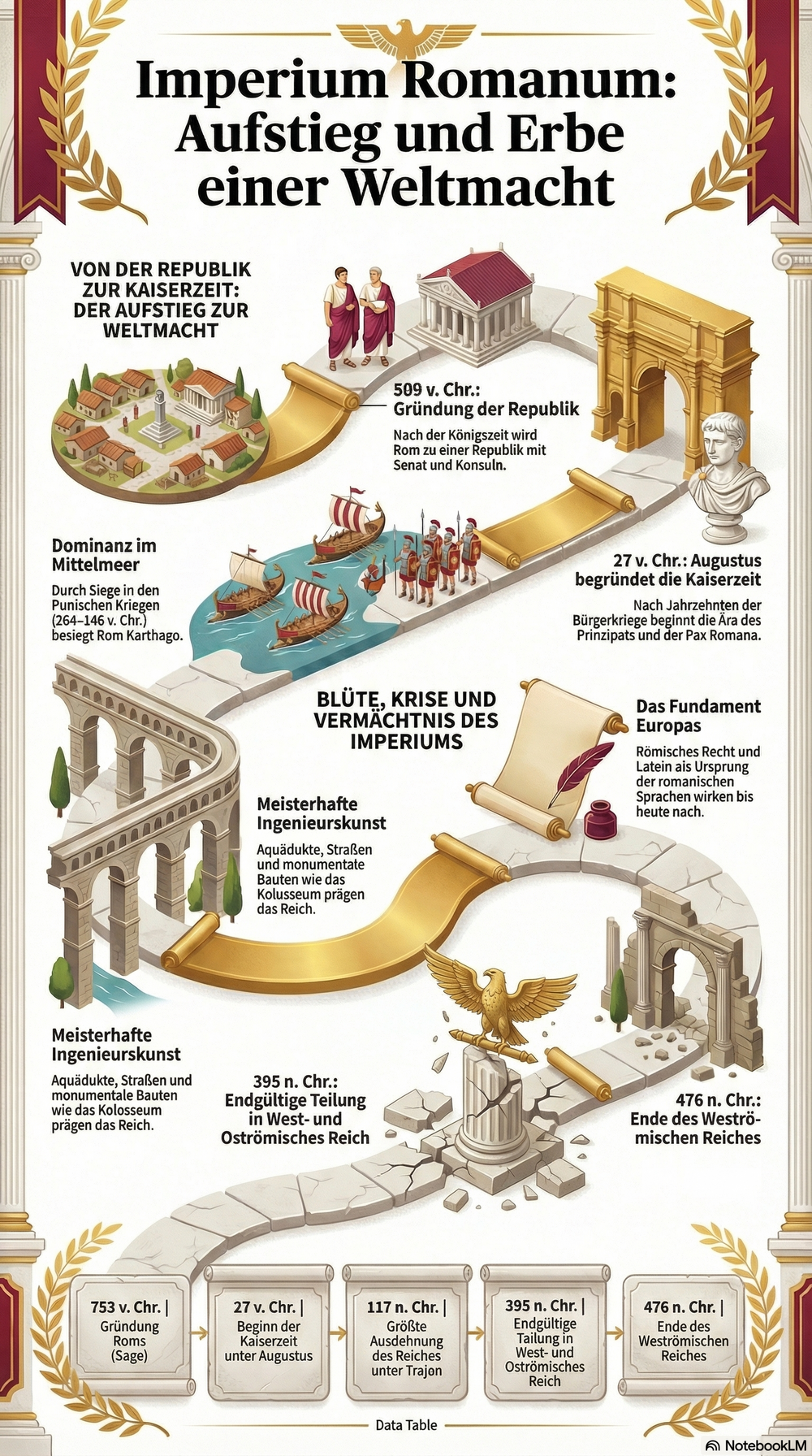 Rom wurde der Überlieferung nach 753 v. Chr. gegründet (Sage um Romulus & Remus). Archäologische Funde zeigen Besiedlungshorizonte bereits im 10. Jahrhundert v. Chr. auf dem Palatin. Nach der Königszeit entwickelte sich 509 v. Chr. die Republik mit jährlich wechselnden Konsuln und einer starken Rolle des Senats. Im 3.–2. Jahrhundert v. Chr. besiegte Rom Karthago in den Punischen Kriegen und wurde zur dominierenden Macht im Mittelmeer. Nach Bürgerkriegen begründete Augustus 27 v. Chr. das Prinzipat – die Kaiserzeit. Unter Trajan erreichte das Reich um 117 n. Chr. seine größte Ausdehnung von Britannien bis Mesopotamien.