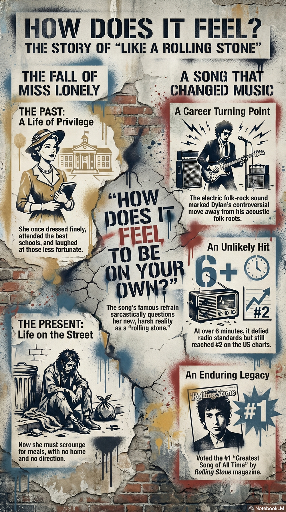 "Like a Rolling Stone" ist ein Lied des amerikanischen Musikers Bob Dylan. Es wurde 1965 auf dem Album "Highway 61 Revisited" veröffentlicht und gilt als einer seiner bekanntesten Songs. Der Song wurde von zahlreichen Künstlern gecovert und in vielen Bestenlisten geführt. In diesem aiMOOC erfahrt ihr mehr über den Song, seine Bedeutung und seinen Einfluss auf die Musikgeschichte.