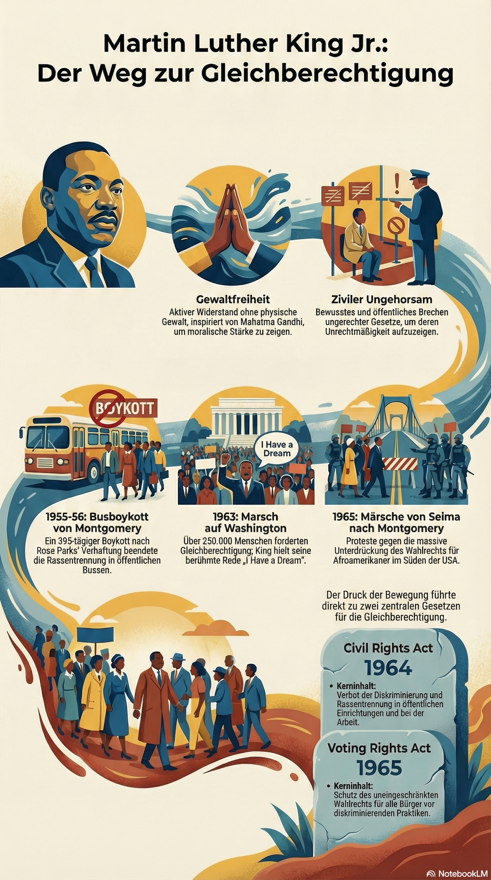 Dieser aiMOOC behandelt Martin Luther King und seinen Einsatz gegen Rassismus in den USA. Du erfährst, wie King als Baptistenpastor und führende Stimme der Bürgerrechtsbewegung mit Gewaltfreiheit und zivilem Ungehorsam die Rassentrennung bekämpfte, historische Kampagnen organisierte und weltweite Wirkung entfaltete. Du lernst zentrale Begriffe, analysierst Reden und beurteilst die Bedeutung seiner Strategie im Vergleich zu anderen Ansätzen für Menschenrechte.
