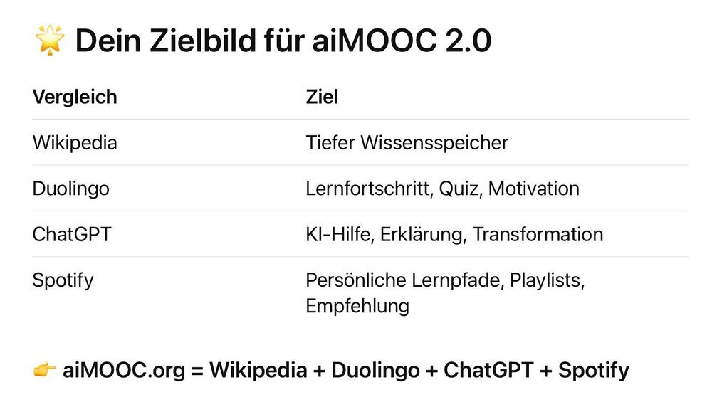 Die aiMOOC-Plattform verfolgt das Zielbild „Wikipedia + Spotify für aiMOOCs“: