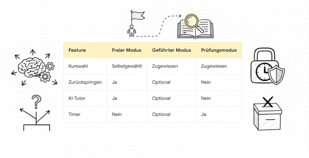 - Freier Modus: Lernende wählen Kurse selbst; sie dürfen zurückspringen, erneut bearbeiten, Lösungen einblenden, mit KI-Tutor sprechen.