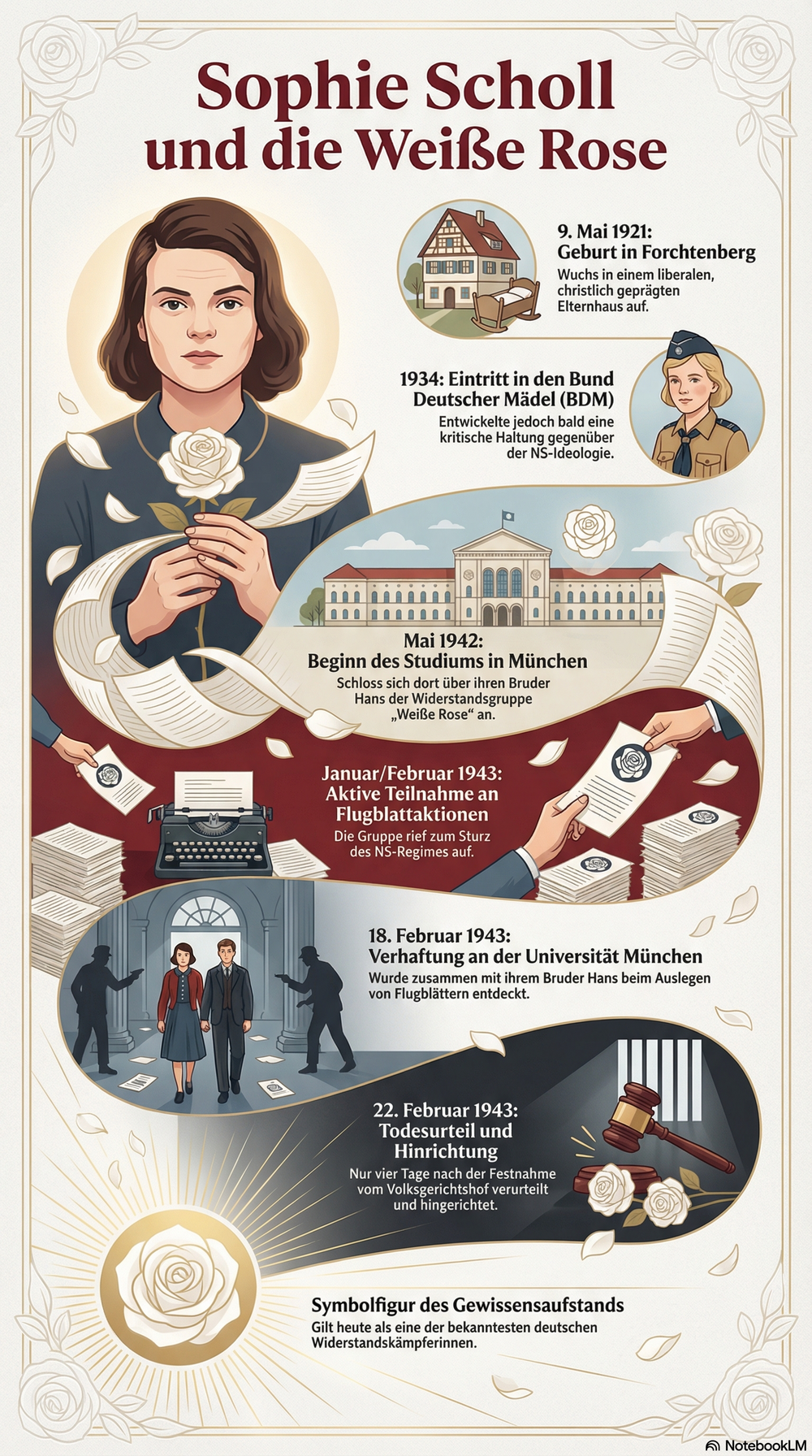 In München schloss sich Sophie Scholl ihrem Bruder Hans Scholl und anderen Mitgliedern der Weißen Rose an. Sie beteiligte sich an der Herstellung und Verteilung von Flugblättern, die zum Widerstand gegen das NS-Regime aufriefen. Am 18. Februar 1943 wurde sie zusammen mit ihrem Bruder von der Gestapo verhaftet und vier Tage später vom Volksgerichtshof zum Tode verurteilt. Sie wurde am selben Tag in der Haftanstalt München-Stadelheim hingerichtet.