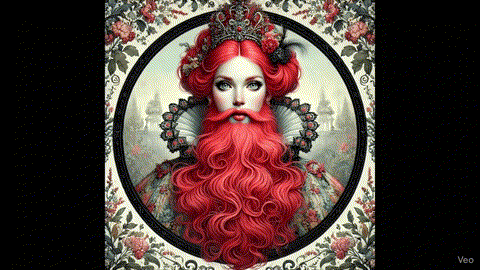 Das auffälligste Merkmal ist ihr leuchtend roter Vollbart: dicht, wellig, weich wie Zuckerwatte, aber glänzend wie frisch poliertes Kupfer. Er fließt in eleganten Locken über ihre Brust und scheint manchmal fast ein Eigenleben zu führen, wenn er sich im Luftzug eines vorbeiziehenden Regenbogens sanft bewegt. Der Bart wirkt zugleich majestätisch und verspielt; in seinem Rot schimmern warme und kühle Nuancen, wie Rubine, die in Gold gefasst wurden. Obwohl er auf den ersten Blick „normal“ aussieht, ist er in Wahrheit ein unendlicher, magischer Speicher: In ihm verbergen sich unzählige kleine Schätze und Hilfsmittel – winzige Werkzeuge, leuchtende Kristalle, gefaltete Karten, magische Samen oder sogar ein Notfall-Himbeereis-am-Stiel –, die man von außen niemals erahnen würde. | |||